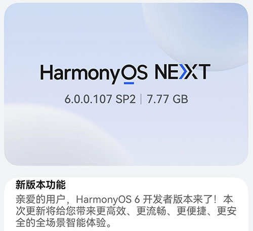 最新的版本號是HarmonyOS6.0.0.107sp2版本,安裝包大小在7.77GB,因為也是囊括了好幾個版本。這次更新里明確提到:“親愛的用戶,鴻蒙OS 6開發者版本本次將帶來高效流暢、更加便捷、健康的全場景智能體驗”,同時還有一個重要補丁包,優化了部分場景的體驗效果,推薦進行更新。