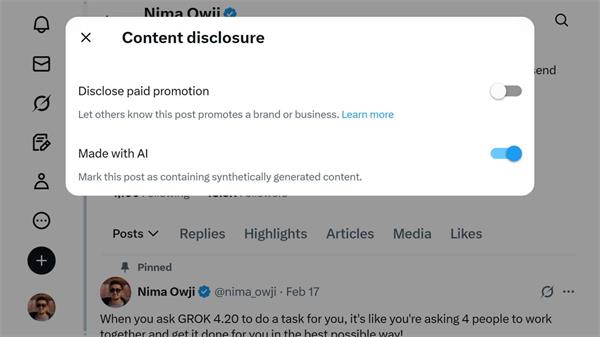 當然如果用戶在發布內容時不勾選這個聲明也是沒問題的,畢竟 X/Twitter 沒法對每條消息都進行檢測,而且即便檢測可能也無法做到百分百的準確率。